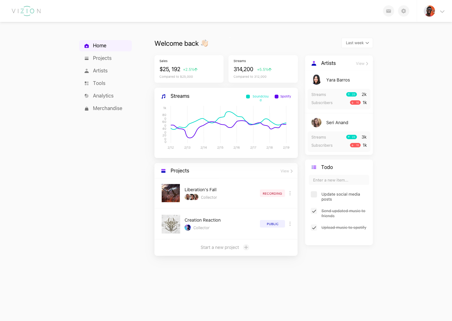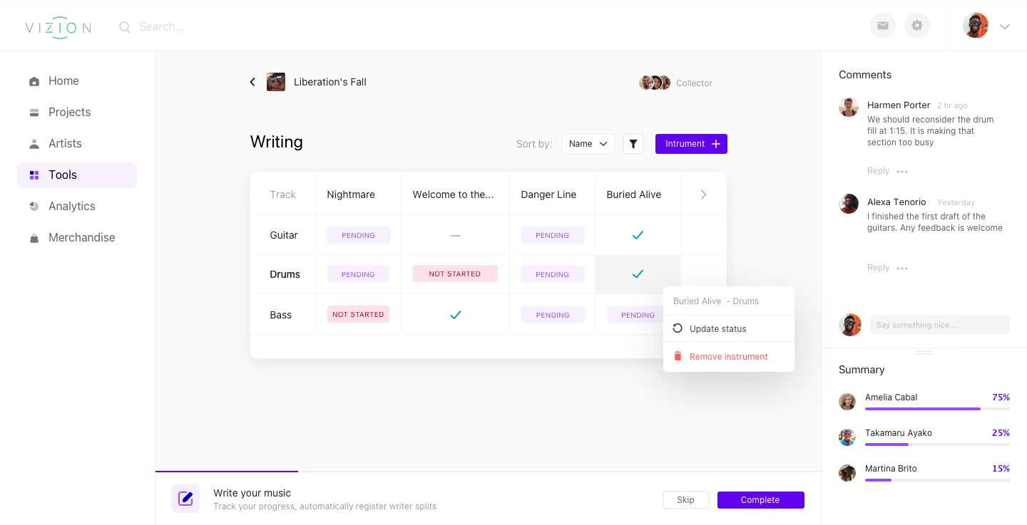 From writing and recording to promotion and touring - VIZION streamlines your entire music journey with collaborative tools, industry connections, and data-driven insights, powered by AI to personalize your journey.