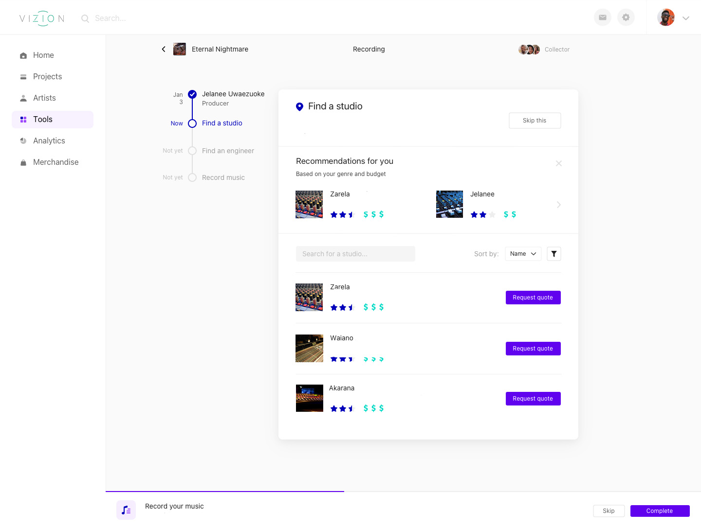 Connect with the studios, engineers, producers best fit for your project. Manage contracts and payouts in one place.