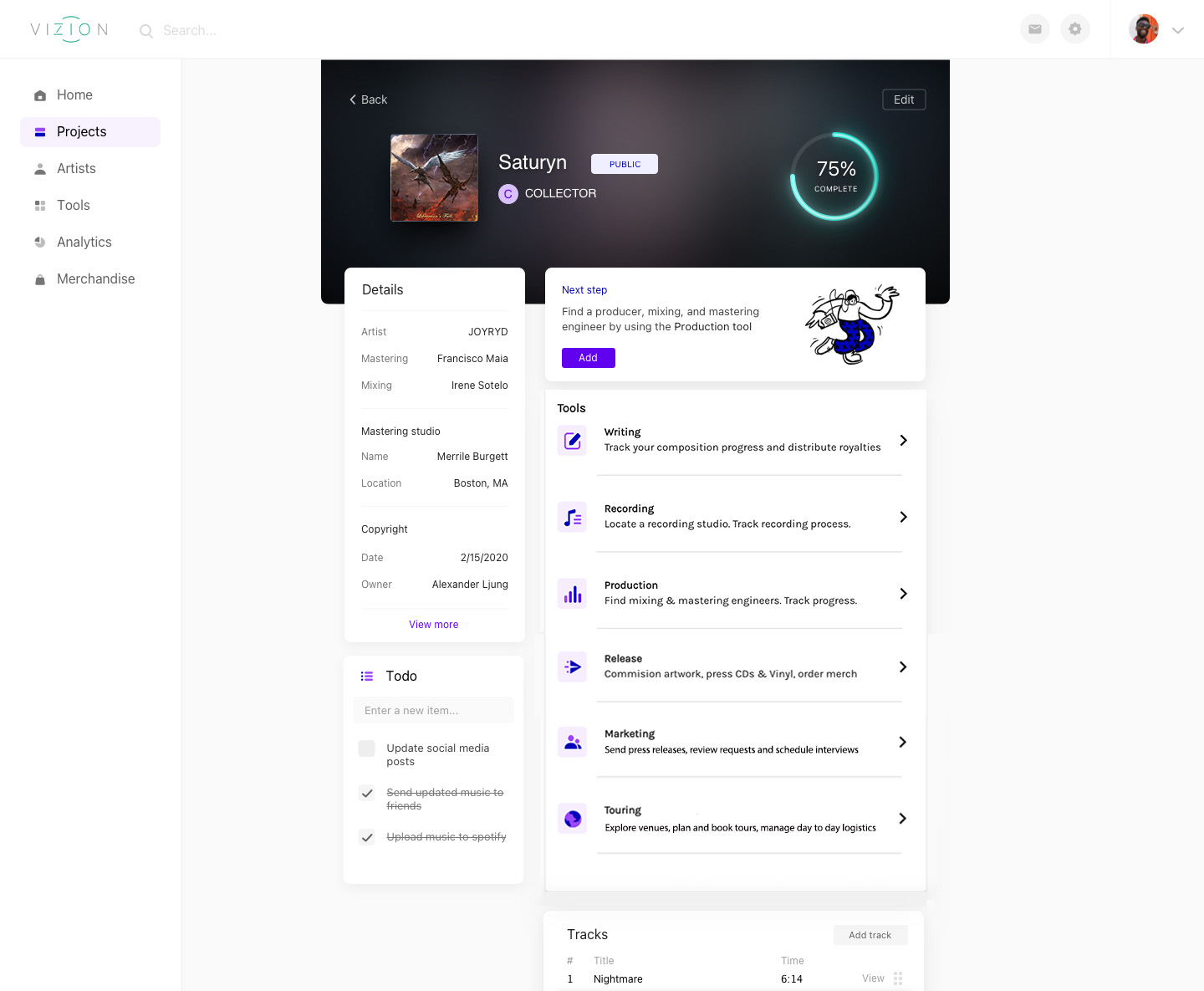 Organize your writing, recording, and production with collaborative boards. Work together with your band, engineers, guest artirts while tracking credity and royalty distributions.